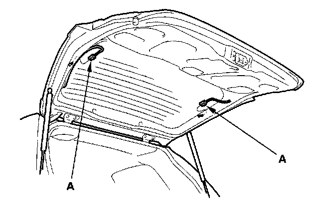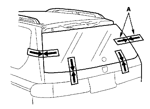 12. Set the rear window in the opening, and center it. Make alignment marks (A) across the rear window, tailgate and body with a grease pencil at the four points shown. Be careful not to touch the rear window where adhesive will be applied.