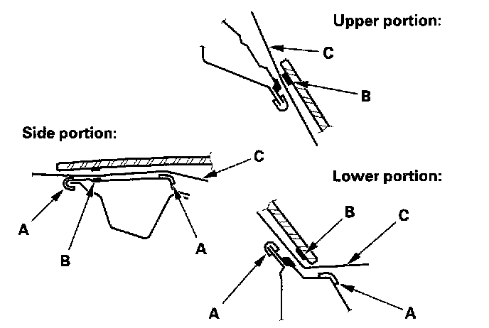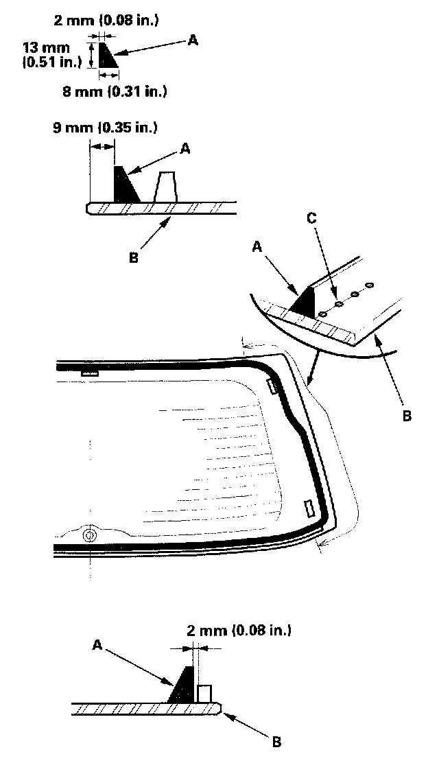 17. Pack adhesive into the cartridge without air pockets to ensure continuous delivery. Put the cartridge in a caulking gun, and run a bead of adhesive (A) around the edge of the rear window (B) as shown. With the printed dots (C) on the rear window as a guide, apply the adhesive to both side portions of the rear window.