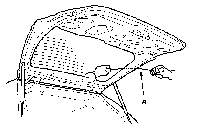 5. With a helper on the outside, pull the piano wire (A) back and forth in a sawing motion. Hold the piano wire as close to the rear window as possible to prevent damage to the tailgate, and carefully cut through the adhesive around the entire rear window.
