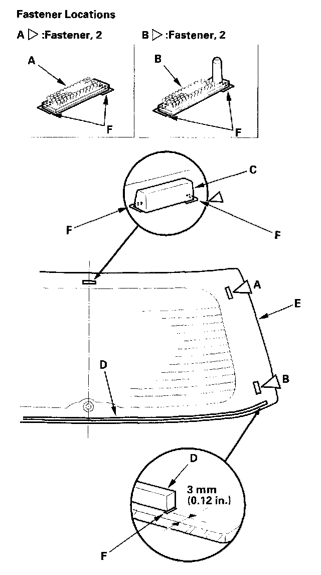10. Glue the upper corner fasteners (A) and lower corner fasteners (B) with adhesive tape (3M 5312, or equivalent). Glue the upper spacer (C) and lower rubber dam (D) with adhesive tape (NITTO 501 M, or equivalent) to the inside surface of the rear window (E) as shown'