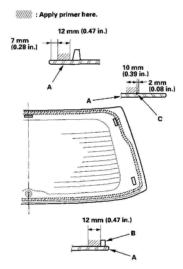 - With the printed dots (C) on the rear window as a guide, apply the glass primer to both side portions of the rear window.