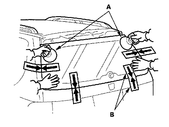 11. Glue the upper corner fasteners (A) and lower corner fasteners (B) with adhesive tape (3M 5312, or equivalent) to the tailgate as shown.