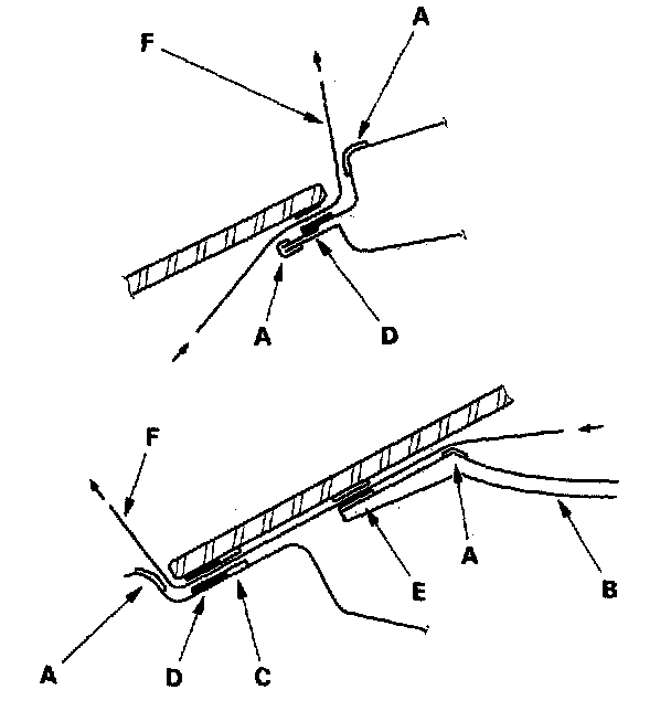 11. Attach the upper rubber dam (A), side rubber dam (B), and lower rubber dam (C) with adhesive tape (NITTO 501 M, or equivalent). Attach the fasteners (D) with adhesive tape (3M 4215, or equivalent) and dashboard seal (E) to the inside face of the windshield (F) as shown:
