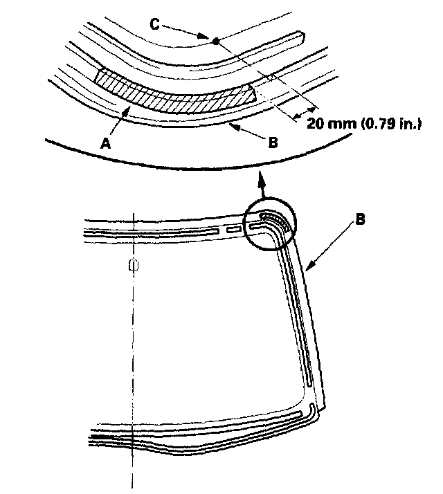 13. Attach the molding (A) with adhesive tape (B) (3M 4212, or equivalent) to the edge of the windshield (C):