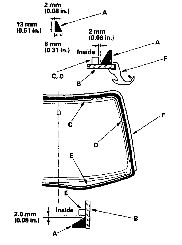 21. Pack adhesive into the cartridge without air pockets to ensure continuous delivery. Put the cartridge in a caulking gun, and run a bead of adhesive (A) around the edge of the windshield (B) between the upper rubber dam (C), side rubber dam (D), lower rubber dam (E) and molding (F) as shown. Apply the adhesive within 30 minutes after applying the glass primer. Make a slightly thicker bead at each corner.