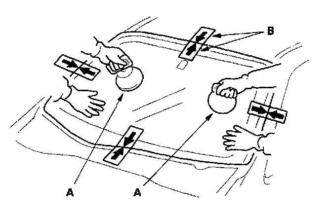 22. Use suction cups (A) to hold the windshield over the opening, align it with the alignment marks (B) made in step 16, and set it down on the adhesive. Lightly push on the windshield until its edges are fully seated on the adhesive all the way around. Do not open or close the doors until the adhesive is dry.