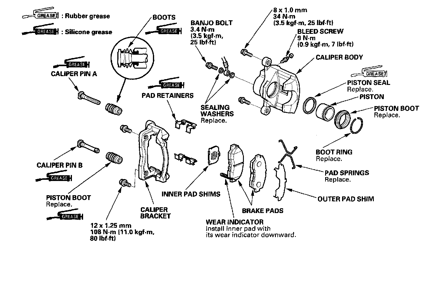 Remove, disassemble, inspect, reassemble, and install the caliper, and note these items: