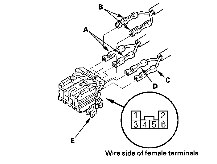 13. Remove the terminal (C) from the connector by pushing the lock tab (D) up in the connector using a thin blade screwdriver (E). Remove all six terminals.