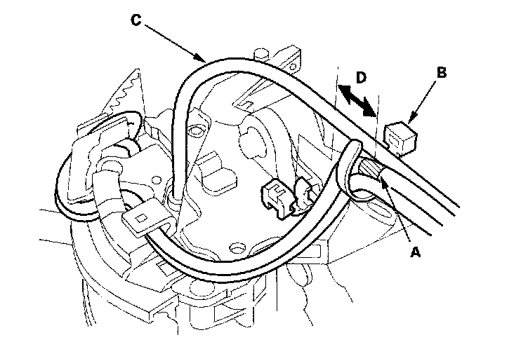 26. Align the marks (A) on the harnesses, and tie the harness band (B) over the marks. Clamp the O/D switch harness (C) 15 mm (0.6 inch) (D) from the harness band.