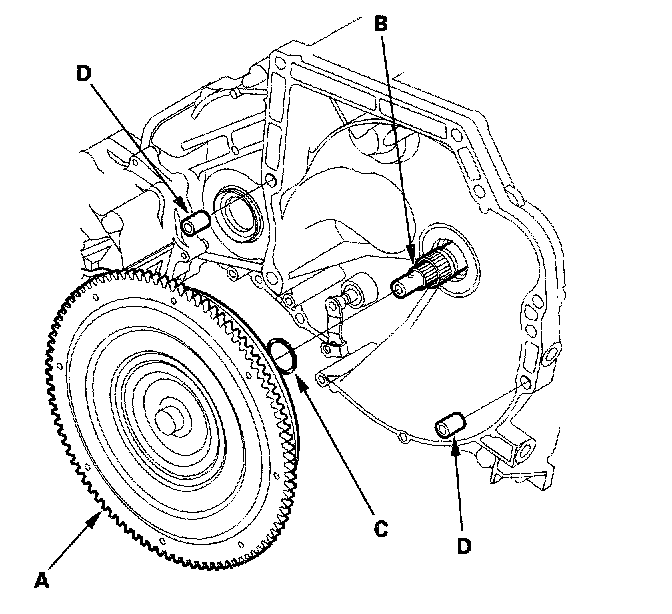 5. Install the 14 x 20 mm dowel pins (D) in the torque converter housing.
