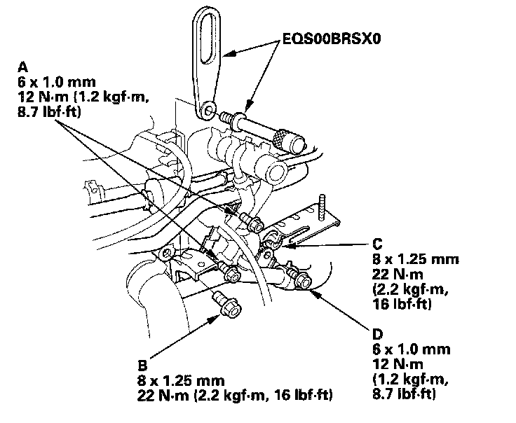 40. Connect the A/T clutch pressure control solenoid valve A connector and 2nd clutch pressure switch connector (B), and install the harness clamps (C) on the clamp brackets (D).
