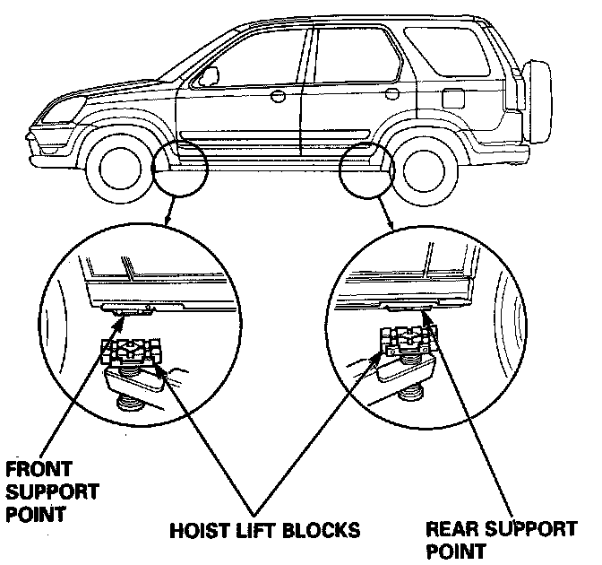 1. Position the hoist lift blocks, or safety stands, under the vehicle's front support points and rear support points.