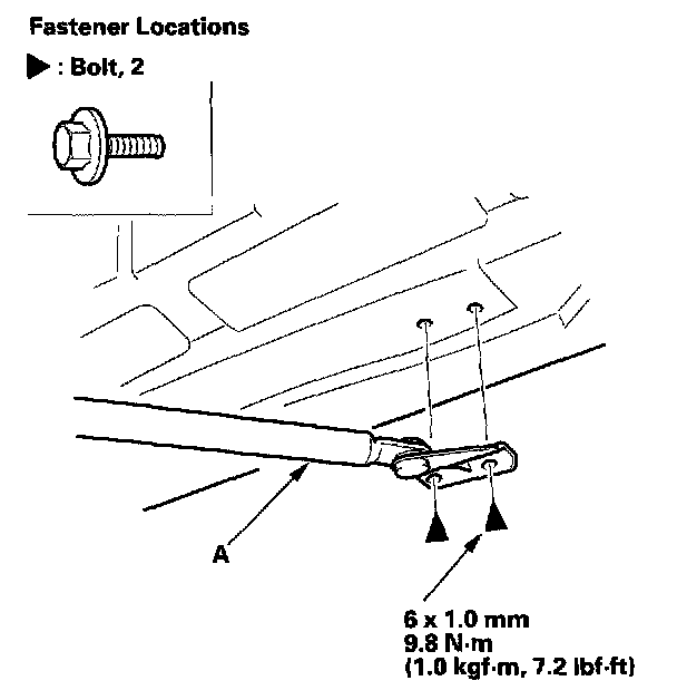 2. Remove the bolts, then remove the support strut (A).