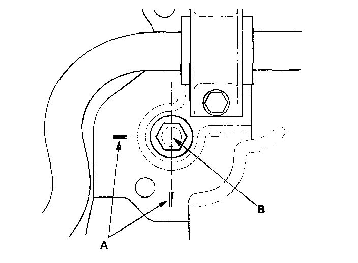 6. Align the reference marks (A) with the center of the sub-frame mounting bolts (B), then tighten the bolts to the specified torque.