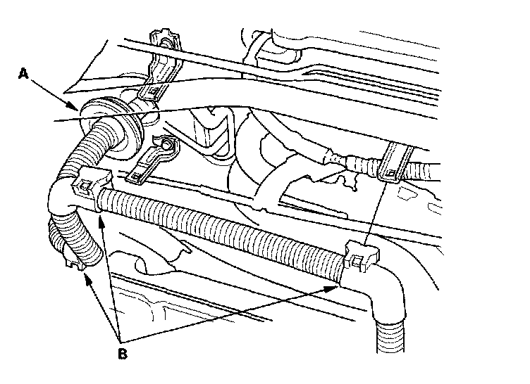 25. Install the upper radiator hose (A) and heater hoses (B).
