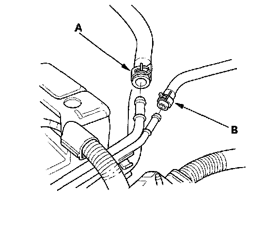 33. Install the brake booster vacuum hose (A) and the evaporative emission (EVAP) canister hose (B).