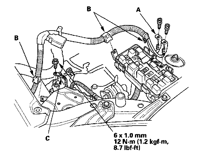 32. Connect the ECM/PCM connectors (A) and main wire harness connector (B). Attach the main wire harness connector to the connector holder (C).
