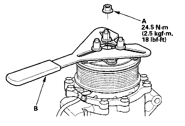 1. Remove the center nut (A) while holding the armature plate with a commercially available A/C clutch holder (B).