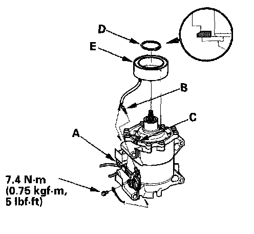 4. Remove the bolt and holder (A), then disconnect the field coil connector (B). Loosen the clamp screw (C) to free the field coil wire. Remove the snap ring (D) with snap ring pliers, then remove the field coil (E). Be careful not to damage the field coil and compressor.