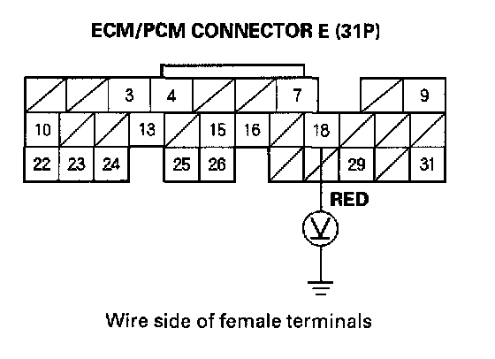 13. Measure the voltage between the No. 18 terminal of ECM/PCM connector E (31P) and body ground with the ECM/PCM connectors connected.