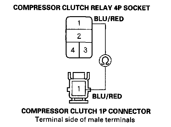 16. Check for continuity between the No.1 terminal of the compressor clutch relay 4P socket and the No.1 terminal of the compressor clutch 1P connector.