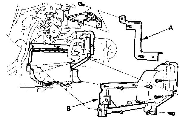 4. Remove the bolt and the ECM/PCM bracket (A). Remove the self-tapping screws and the expansion valve cover (B).