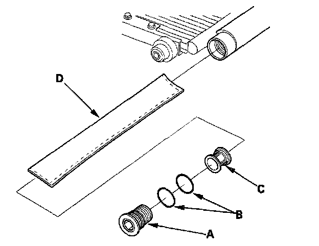 2. Remove the cap (A) from the bottom of the condenser, then remove the O-ring (B), the filter (C) and the desiccant (D).