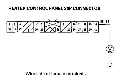 11. Measure the voltage between the No.14 terminal of the healer control panel 30P connector and body ground.