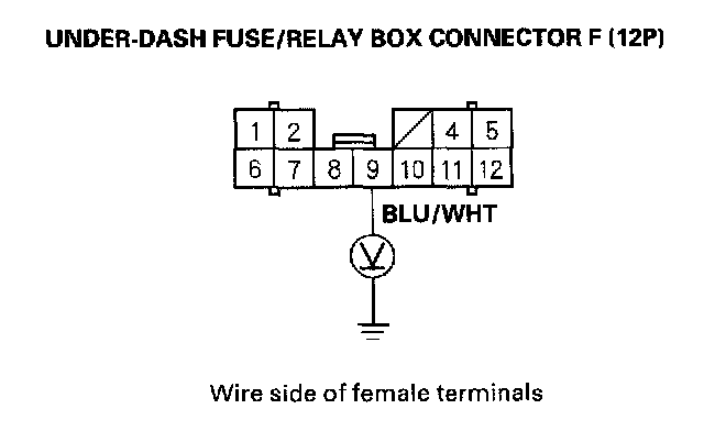 13. Measure the voltage between the No.9 terminal of under-dash fuse/relay box connector F (12P) and body ground with the under-dash fuse/relay box connectors connected.