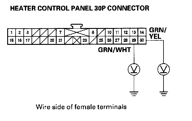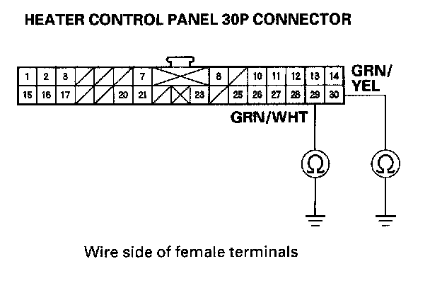 8. Check for continuity between the No.29 and No.30 terminals of the heater control panel 30P connector and body ground individually.