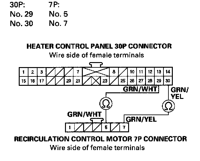 11. Check for continuity between the following terminals of the heater control panel 30P connector and the recirculation control motor 7P connector.