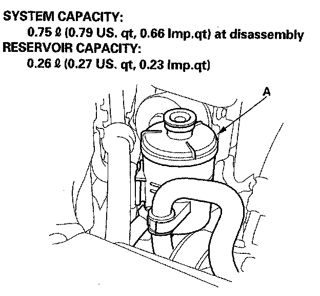 ReplacementCheck the reservoir (A) at regular intervals, and add the recommended fluid as necessary. Always use Honda Power Steering Fluid. Using any other type of power steering fluid or automatic transmission fluid can cause increased wear and poor steering in cold weather.