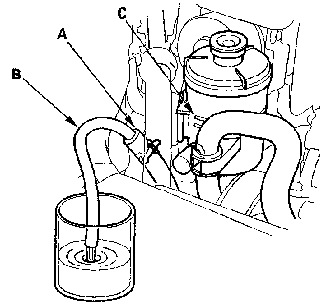 3. Start the engine, let it run at idle, and turn the steering wheel from lock-to-lock several times. When fluid stops running out of the hose, shut off the engine. Discard the fluid.