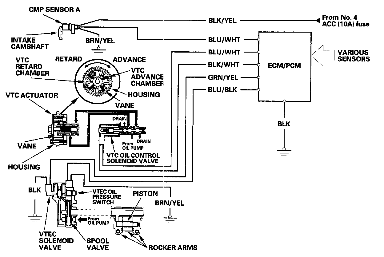 - The VTC changes the phase of the intake camshaft via oil pressure. It changes the intake valve timing continuously.