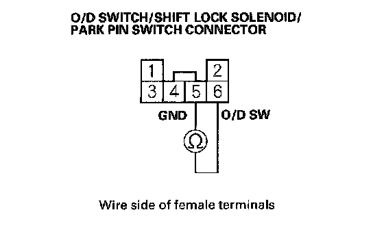 3. Check for continuity between the No. 5 and No. 6 terminals of the O/D switch/shift lock solenoid/park pin switch connector while pushing the O/D switch and when the switch is released.