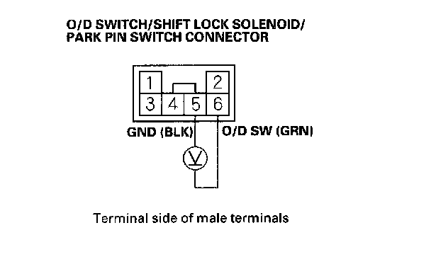 6. Measure the voltage between the No. 5 and No. 6 terminals of the O/D switch/shift lock solenoid/park pin switch connector.