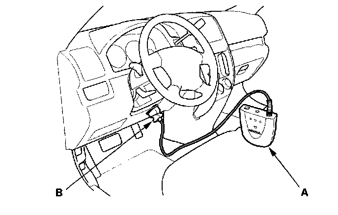 2. Connect the Honda Interface Module (HIM) (A) to the data link connector (DLC) (B) located under the driver's side of dashboard.