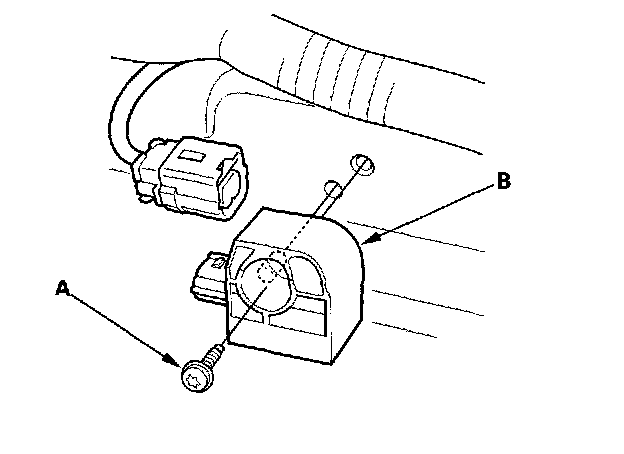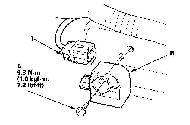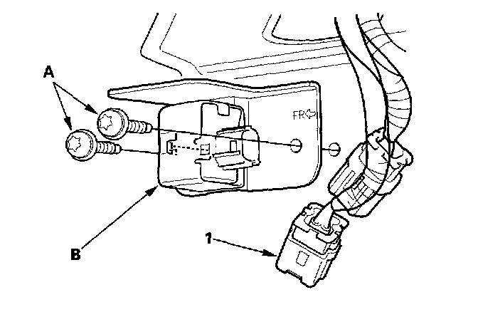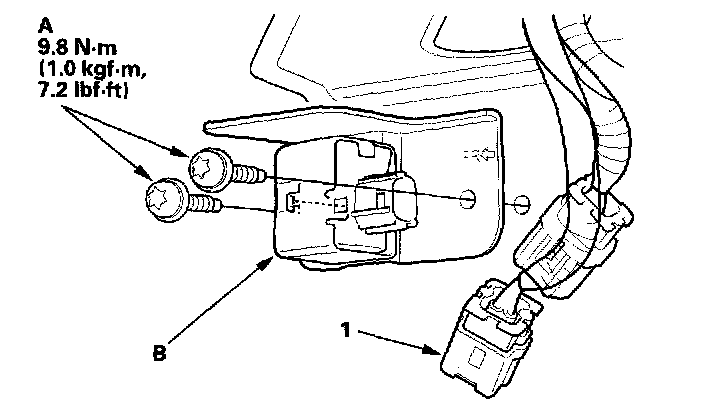 1. Install the new side impact sensor with a new Torx bolt (A) then connect the floor wire harness 2P connector (1) to the side impact sensor (B).