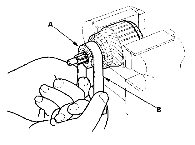 4. Check the commutator (A) surface. If the surface is dirty or burnt, resurface with emery cloth or a lathe within the following specifications, or recondition with #500 or #600 sandpaper (B).