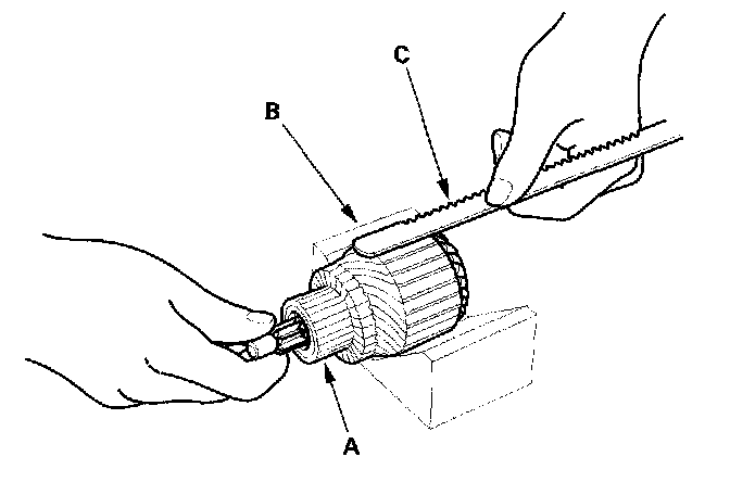 9. Place the armature (A) on an armature tester (B). Hold a hacksaw blade (C) on the armature core. If the blade is attracted to the core or vibrates while the core is turned, the armature is shorted. Replace the armature.