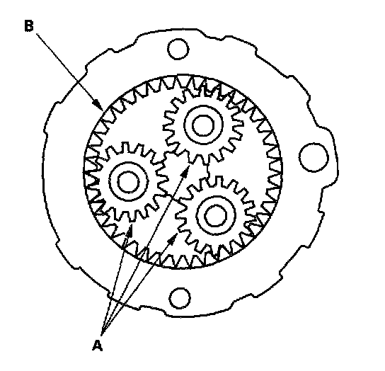 13. Check the planetary gears (A) and ring gear (B). Replace them if they are worn or damaged.