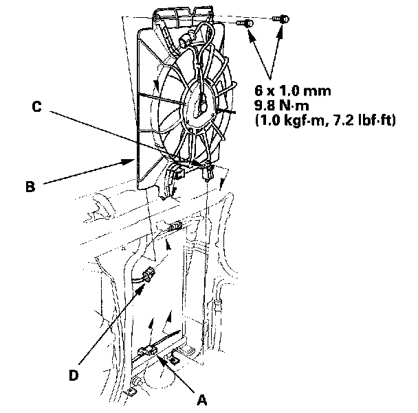9. Remove the compressor clutch connector (A) from the condenser fan shroud (B), then open the wire harness clip. Disconnect the condenser fan connector (D). Remove the upper mounting bolts and the condenser fan shroud. Be careful not to damage the radiator fins when removing the condenser fan shroud.