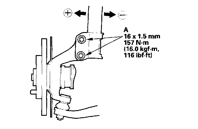 2. Loosen the flange nuts (A) and bolts, and adjust the camber by moving the bottom of the damper within the range of the damper pinch bolt free play. Tighten the flange nuts to the specified torque.