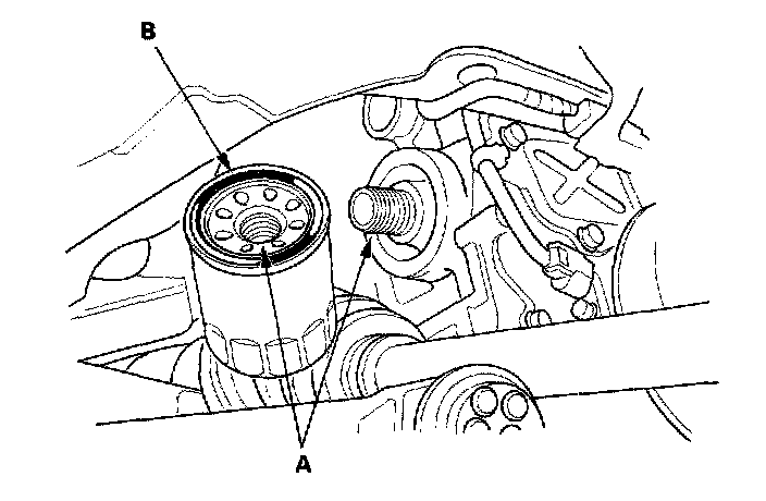 2. Inspect the threads (A) and rubber seal (B) on the new filter's. Clean the seat on the engine block, then apply a light coat of oil to the filter's rubber seal. Use only filters with a built-in bypass system.