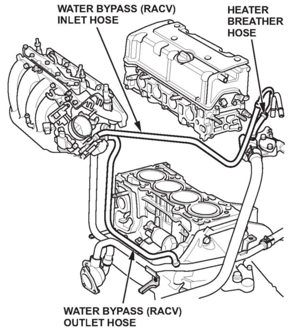 3. Replace the water bypass (RACV) inlet and outlet hoses and the heater breather hose.