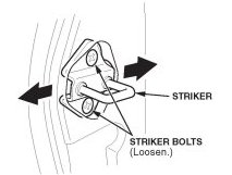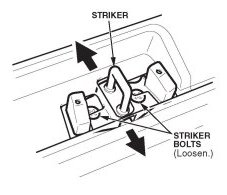 2. Slightly loosen the striker bolts, and adjust the striker in or out to get the proper measurement. Torque the striker bolts to 22 N.m (16 lb-ft).