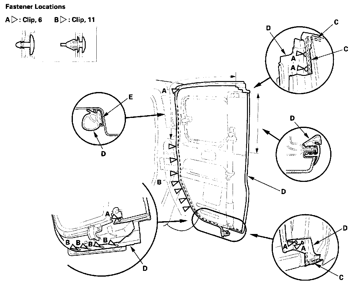 1. Detach the clips (A, B), release the double-sided adhesive tape (C), then remove the door weatherstrip (D).