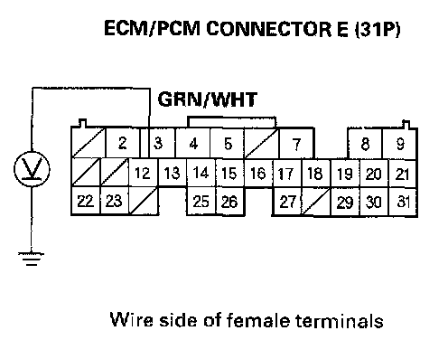 9. Using the Backprobe Set, measure the voltage between the No. 12 terminal of ECM/PCM connector E (31P) and body ground with the ECM/PCM connectors connected.