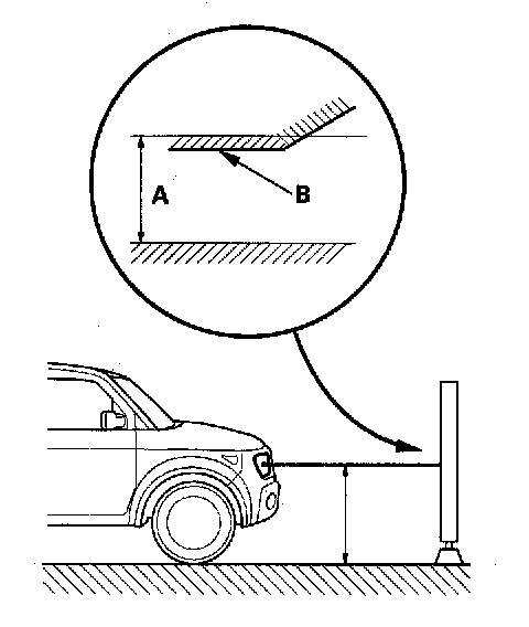 Measure the height of the headlights (A). The lights should reflect 52 mm (2.1 in.) below headlight height (B).