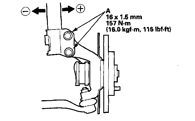 4. Loosen the flange nuts (A), and adjust the camber by moving the bottom of the damper within the range of the damper pinch bolt free play. Tighten the flange nuts to the specified torque.